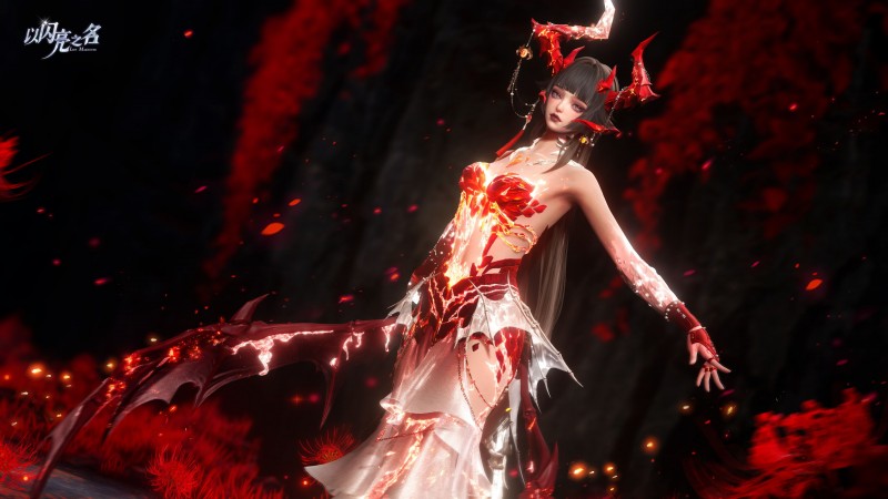 冥焰熔骨五星时装的设计中,使用了非对称龙角头饰打破了传统对称美学的沉闷,缝隙中持续流淌的岩浆特效,通过Shader编程实现了黏连感与吞噬感的平衡,既不像普通液体那样呆板,又带着活物般的生命力。