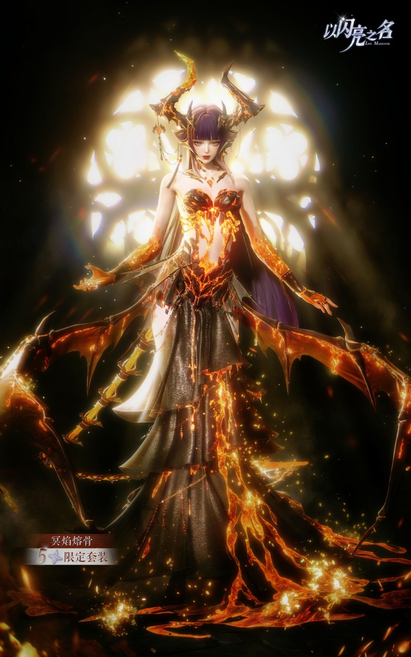 与之相对,另外一套五星时装冥焰熔骨则演绎了毁灭中的创造这一理念。《以闪亮之名》以火山地质为灵感,用黑曜石构建巨龙的筋骨,让岩浆成为流动的血脉,带来了这套酷飒与性感兼顾的全新套装。这套以创世火山为核心灵感的时装,不仅用极致的视觉设计还原龙裔女爵的威严气场,更通过技术让岩浆流动、火焰明灭的动态美感跃然屏幕,成为版本中极具冲击力的幻想美学代表作之一。