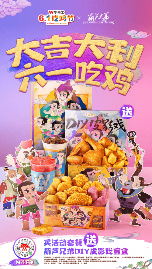 华莱士相关负责人表示,一年一度的儿童节不再是独属孩子们的快乐,已经成为了一个与成人、孩子都息息相关的重要节日。华莱士希望通过推出六一吃鸡节为消费者提供更优质、更温馨、更有趣、更有情怀的用餐体验,让消费者获得独一份的快乐,永远保持一颗童心;同时更希望通过“葫芦娃套餐”、葫芦娃联名包装和葫芦娃皮影等活动,让大朋友小朋友们“零距离”了解非遗文化,感受皮影之美,感受传统文化之美,引导更多人宣传皮影等非遗文化,让我们都意识到,对于中国人来说,只有国潮华流才是顶流!