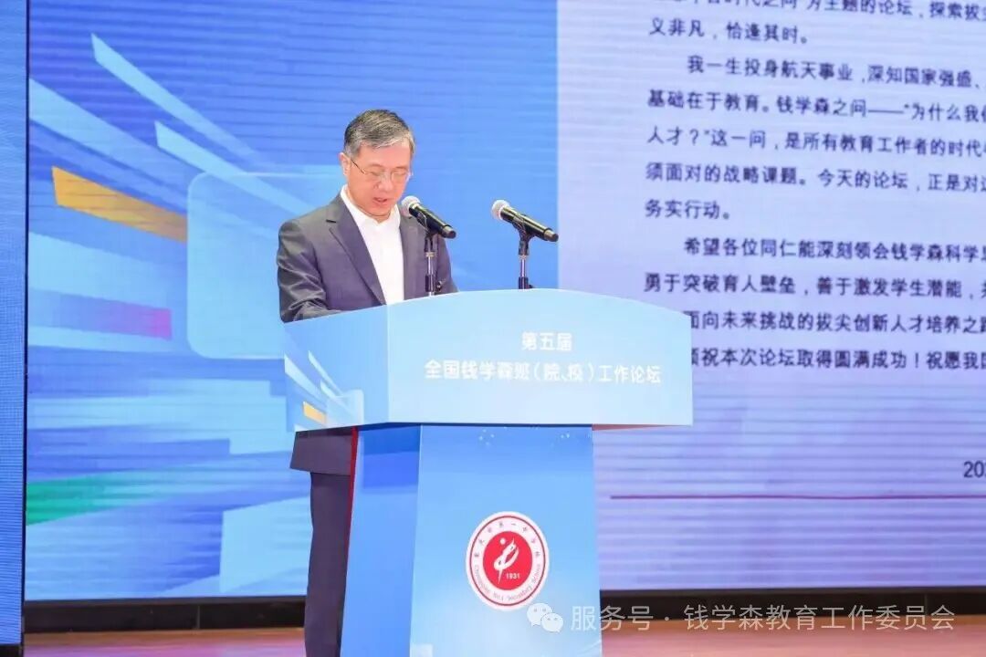 现场,中国航天基金会副理事长侯秀峰宣读了中国工程院院士戚发韧的贺信。贺信提到,此次论坛是对“钱学森之问”的积极响应和务实行动,勉励大家深刻领悟钱学森科学思想与爱国精神的时代内涵,共同探索出一条立足中国大地,面向未来挑战的拔尖创新人才培养之路。 钱学森教育工作委员会——冠名管理委员会主任曲麒富宣读“钱学森班、校冠名申请批复” 新成立钱学森班(院、校)集体授牌仪式 钱学森教育工作委员会——冠名管理委员会主任曲麒富宣读“钱学森班、校冠名申请批复”,上海交通大学钱学森图书馆馆长、钱学森教育工作委员会主任委员钱永刚为41家新成立的钱学森班(院、校)逐一授牌。这一仪式标志着钱学森教育思想在全国基础教育领域的进一步推广与深化,也彰显了教育工作者传承红色基因、培育时代新人的坚定信念。 传承精神火炬 激荡报国情怀 随后,原马兰基地政委、“两弹一星”历史研究会常务副理事长、将军孔令才作题为《学习传承“两弹一星”精神 做新时代强国复兴征程上的追梦人》的主旨报告。他通过大量珍贵的历史影像、原始档案和实物资料,系统回顾了“两弹一星”事业从艰难起步到辉煌成功的伟大历程,深情讲述了一代代科技工作者、解放军官兵和建设者响应党的号召,隐姓埋名、奔赴戈壁荒漠,在极端艰苦条件下攻克尖端科技难题的动人故事。 原马兰基地政委、“两弹一星”历史研究会常务副理事长、将军孔令才作报告 “是我们回国参加祖国建设工作的时候了。祖国的建设急迫地需要我们!”“听吧!祖国在向我们召唤……”当这些穿越时空的声音在礼堂响起,现场师生无不为之动容。孔令才指出,正是这段波澜壮阔的历史,孕育出“热爱祖国、无私奉献,自力更生、艰苦奋斗,大力协同、勇于登攀”的“两弹一星”精神,这是中华民族宝贵的精神财富,更是激励青年一代奋勇前行的不竭动力。 讲座中,孔令才围绕“厚植家国情怀”“勇于创新超越”“矢志奋斗奉献”三大维度,深入阐释“两弹一星”精神的时代价值。他从钱学森突破重重阻挠、历经五年斗争终归祖国的感人经历讲起,还原了这位“中国航天之父”在美被软禁仍矢志报国的坚定信念;又动情讲述了邓稼先隐姓埋名28年、王淦昌“我愿以身许国”、于敏“国产专家一号”、王承书三次“我愿意”等一个个震撼人心的故事。 “对他们而言,祖国的需要就是人生的方向,国家的使命就是毕生的追求。”报告厅内,许多师生在动情处热泪盈眶。“这盛世,如您所愿;这未来,由我们守护!”不少同学红着眼眶表示,要以老一辈科学家为榜样,坚定理想信念,心怀“国之大者”,把个人小我融入国家大我,听党话、跟党走,扣好人生第一粒扣子,做堂堂正正、光荣自豪的中国人。 第五届全国钱学森班(院、校)工作论坛开幕式现场 论坛于下午同步举行三场平行分论坛,分论坛一“筑体系·育英才——拔尖创新人才培养的生态构建”聚焦课程体系与协同机制;分论坛二“强内核·铸底色——科学精神引领下的育人探索”探讨科学精神与人格培育;分论坛三“启智慧·照前路——拔尖创新人才培养的未来愿景”展望教育变革方向。 西安交大钱学森学院常务副院长杨森、浙江省杭州高级中学副校长高利、上海交大机械与动力工程学院教学院长夏唐斌、重庆市巴蜀中学副校长宋晓宇、国防科技大学理学院大校副院长谭洪涛、西安高新第一中学校长助理李维、钱学森教育工作委员会秘书长姚海根,钱学森教育工作委员会副秘书长(常务)朱廉等20余位专家通过案例分享、对话交流,为参会者提供可借鉴的实践模型。 此次论坛的举办,不仅是对钱学森教育思想的深刻践行,更是一次思想的碰撞、智慧的汇聚与使命的再出发。 第五届全国钱学森班(院、校)工作论坛开幕式现场