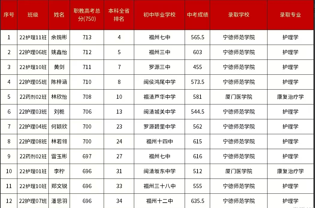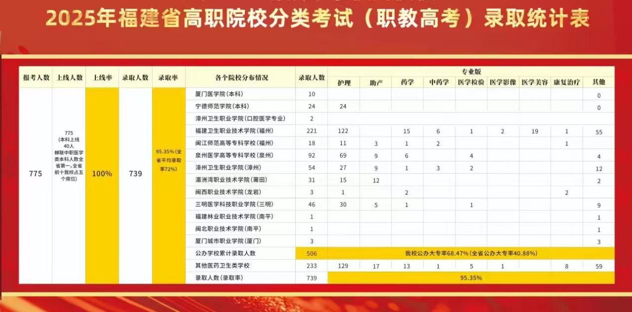 根据日前省教育厅公布的2025年福建省高职分类招考(职教高考)录取控制分数线,我校2022级参加考试同学100%通过专科录取控制分数线,全部上线。其中有40人本科上线,达到医药卫生类本科录取控制分数线,有5人在医药卫生类总成绩中全省排名前十位(全省第四名,第五名,第七名,第八名,第十名)。医学类本科上线人数全省第一,继续保持成绩领先记录。特向全校师生报喜!向2022级师生和家长表示热烈祝贺!希望23级、24级师生坚定信心,再接再厉,奋力拼搏,再创辉煌!
