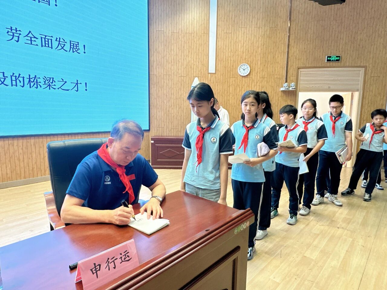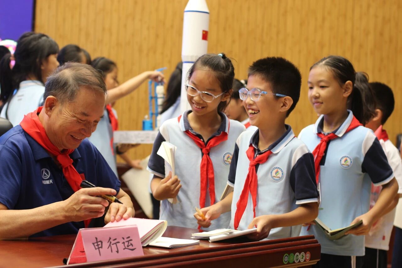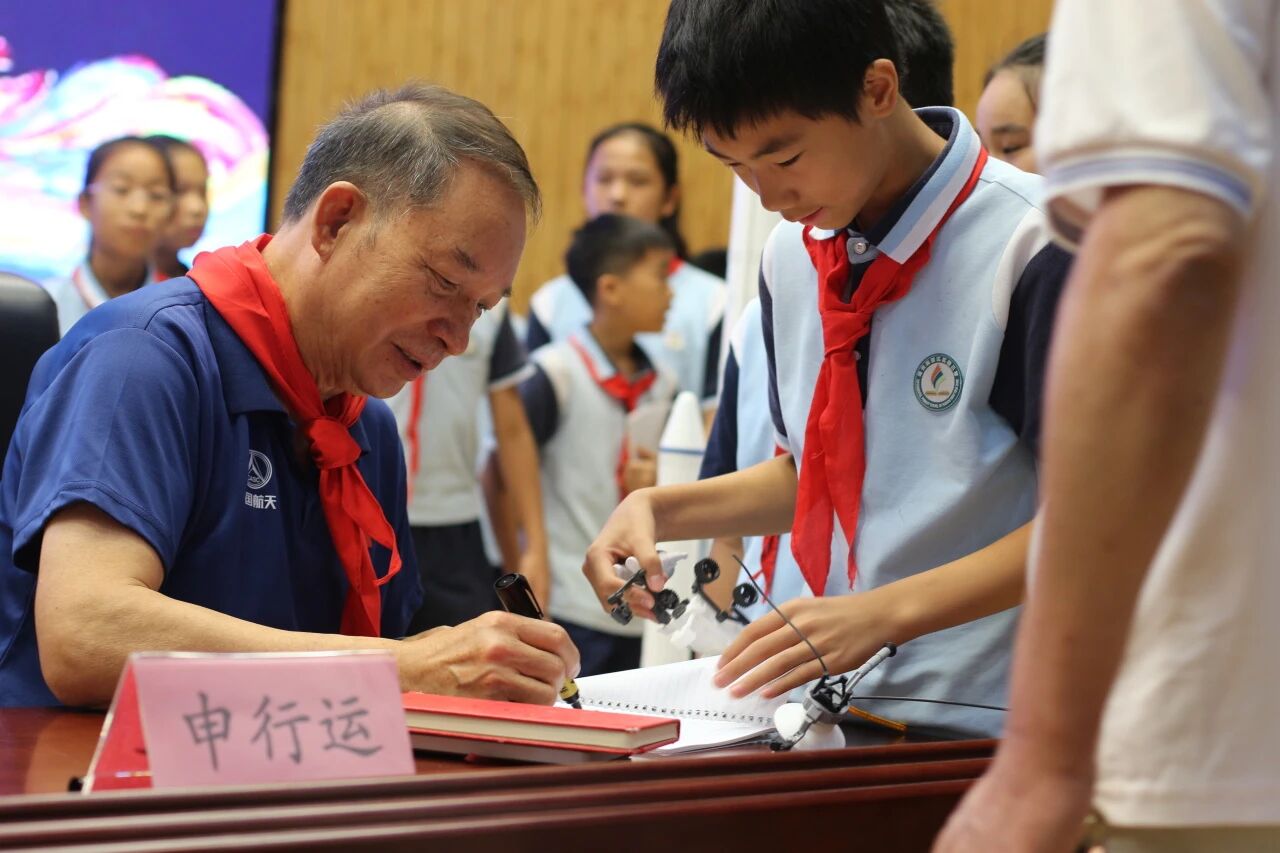 最令人期待的互动环节中,各班学生代表手持心爱的笔记本以及航天模型,有序走上台,怀着崇敬之心请申大队长签名。