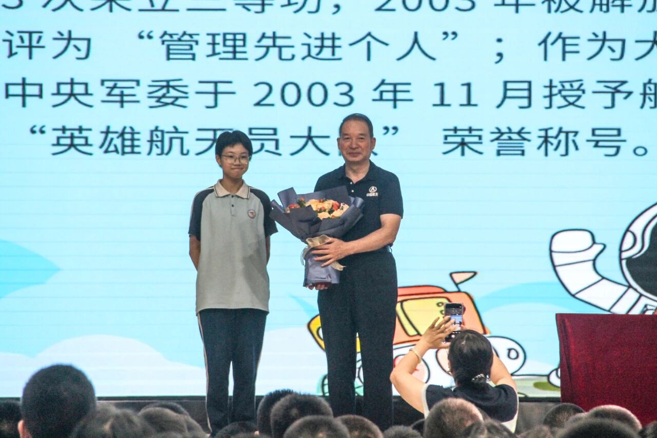 学生代表手捧鲜花,面带敬意地向申大队长献花,表达对航天专家的欢迎与崇敬。